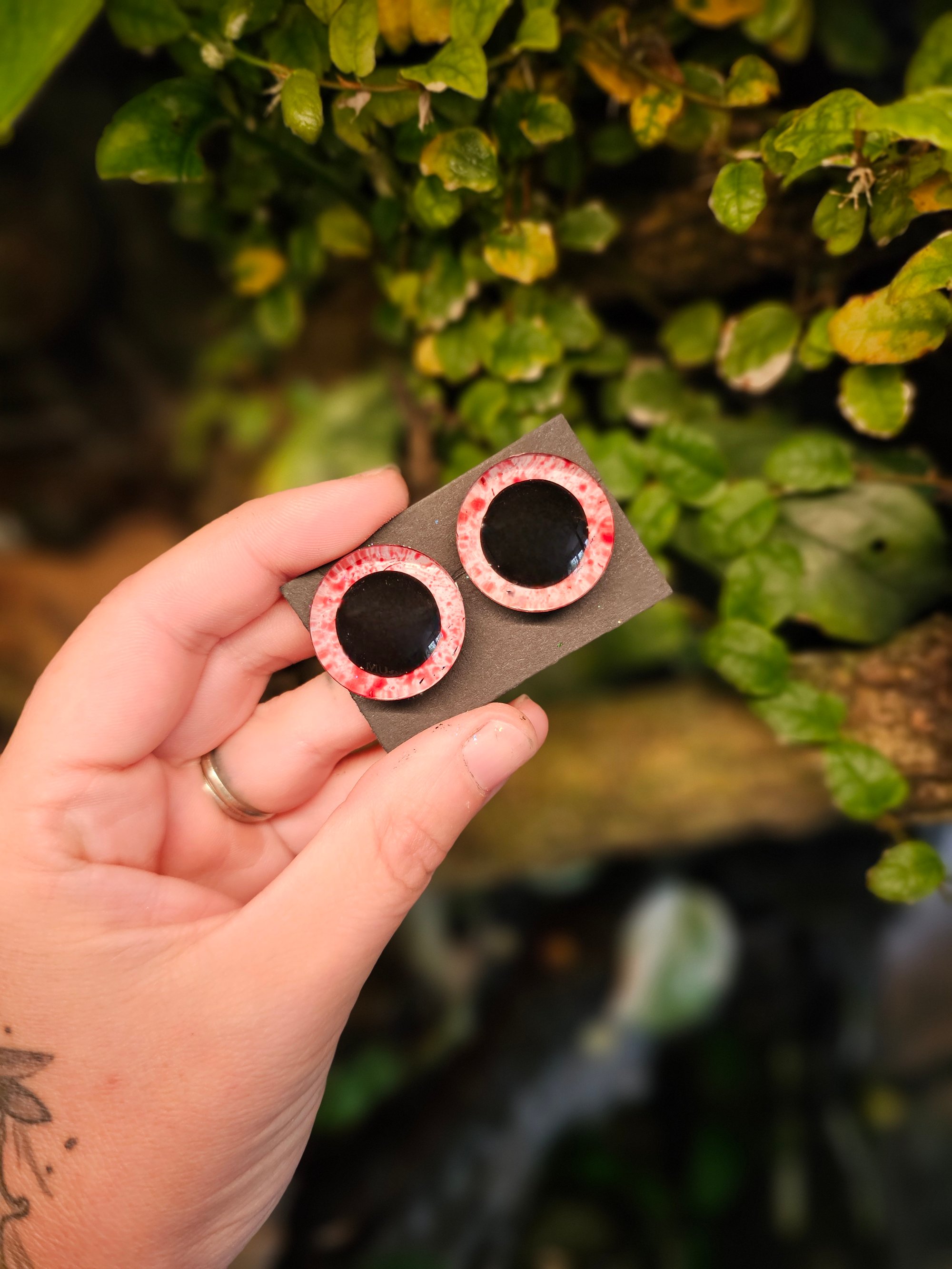 Each pair is hand-painted to perfection — a glossy, inky black pupil surrounded by that freshly splattered red rim we’ve all been dying for. Every single set comes out slightly different, like a little murder scene in miniature.